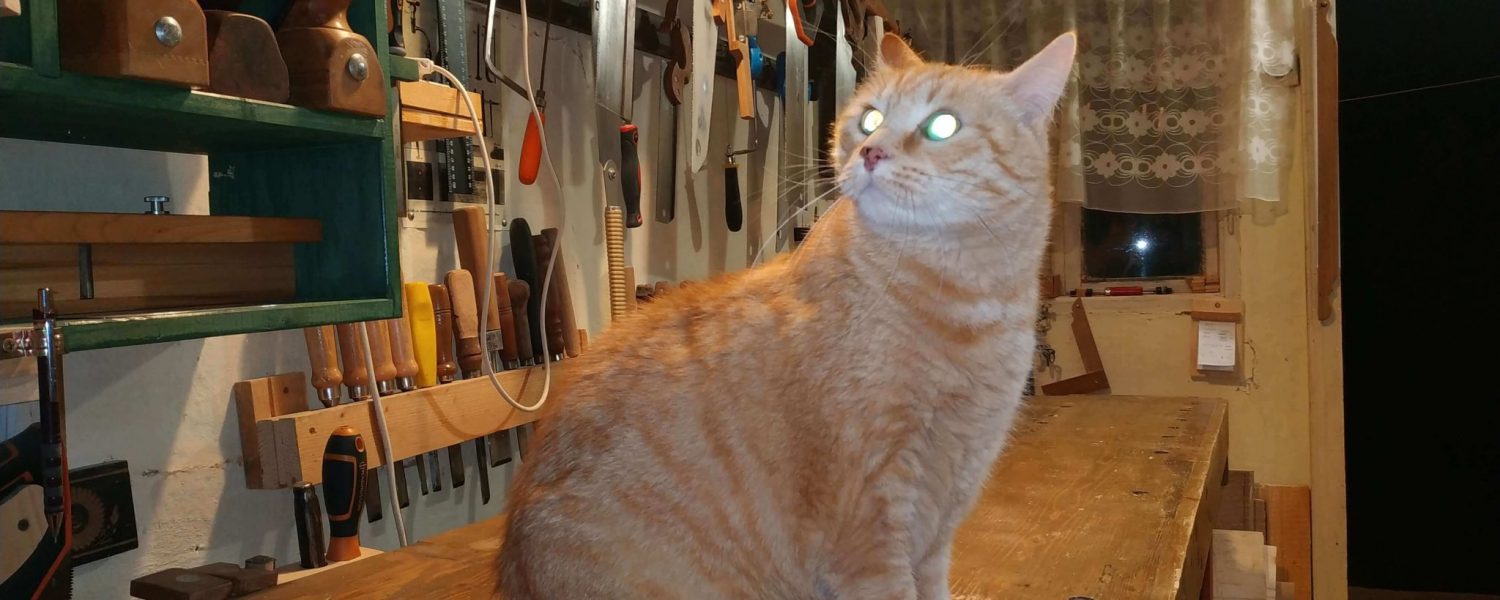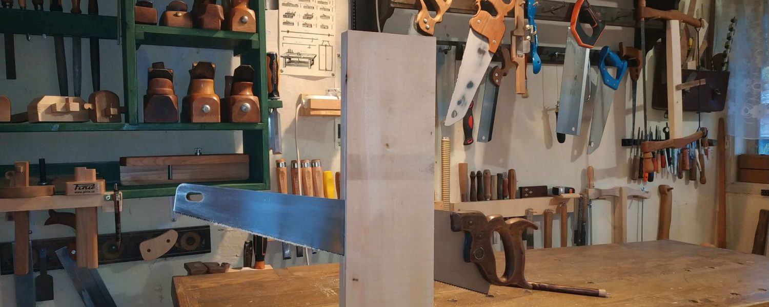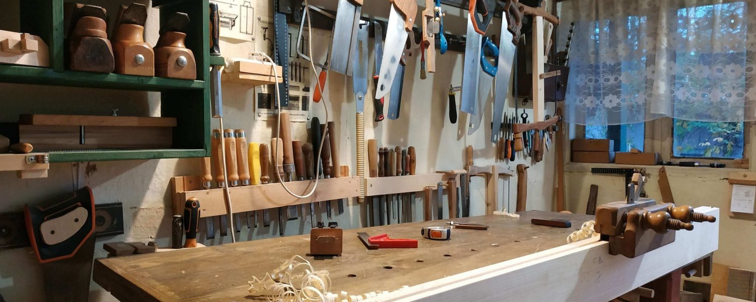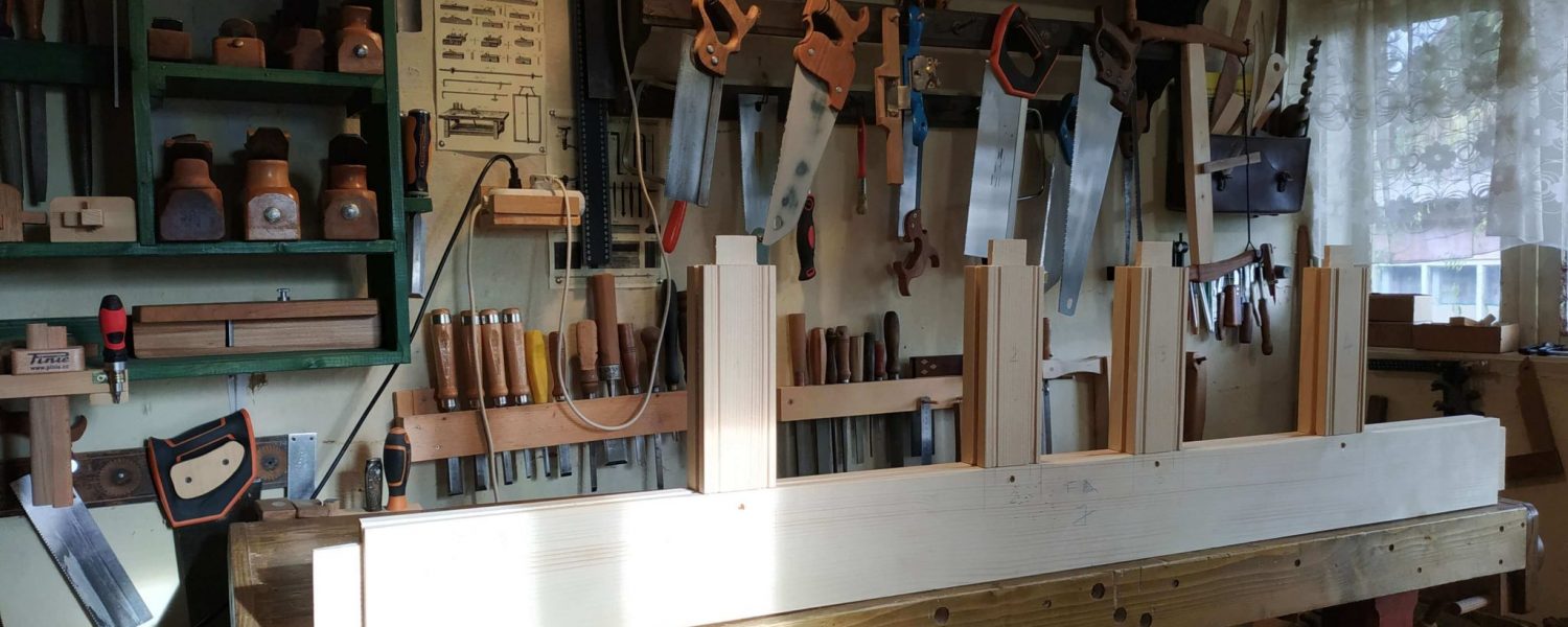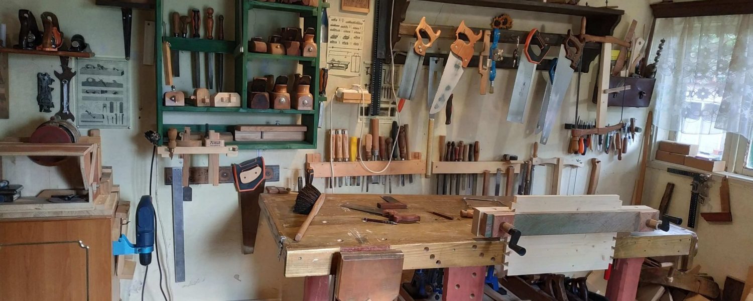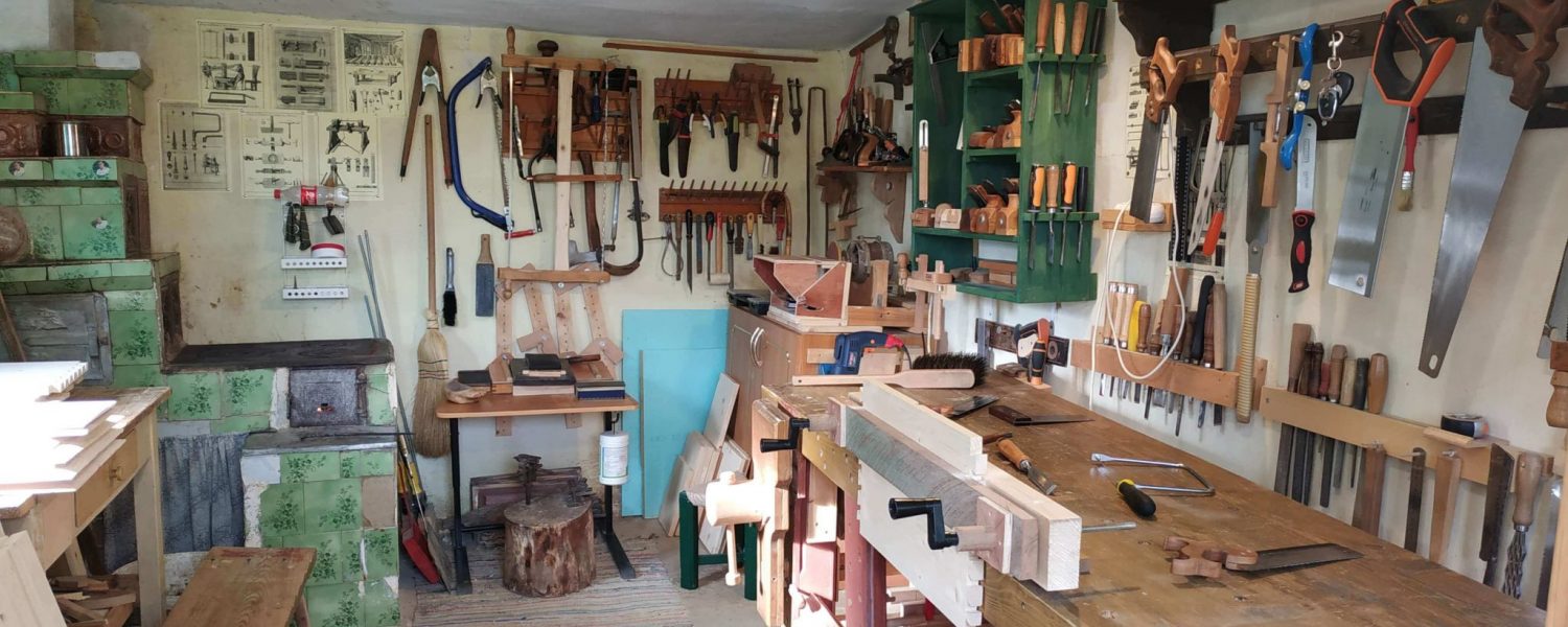Atelierul l-am amenajat intr-o camera mica din chirpici in care au locuit bunicii mei, iar o parte dintre uneltele pe care le folosesc au apartinut bunicului din partea mamei. O alta parte dintre unelte le-am cumparat din targurile de vechituri sau de pe internet, iar pe altele le-am construit singur (bancul de lucru, strung, rindele, fierastraie, echere, cutite etc.).