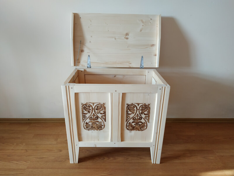 O piesa traditionala, cufarul din fotografii are fatada si partile laterale din doua panouri, iar stalpii sunt lasati mai lungi pentru a forma picioarele. Spre deosebire de cuferele imbinate in coada de randunica acest cufar are imbinari cu cep propriu si scobitura. Acest tip de constructie se foloseste de obicei pentru a atenua efectele lucrului lemnului si este mai complex deoarece are multe imbinari cu cepuri proprii, precum si multe uluce in care stau panourile. Un cufar cu panouri va lucra, insa efectele nu se vor simti cu exceptia unor modificari infime pe inaltime.